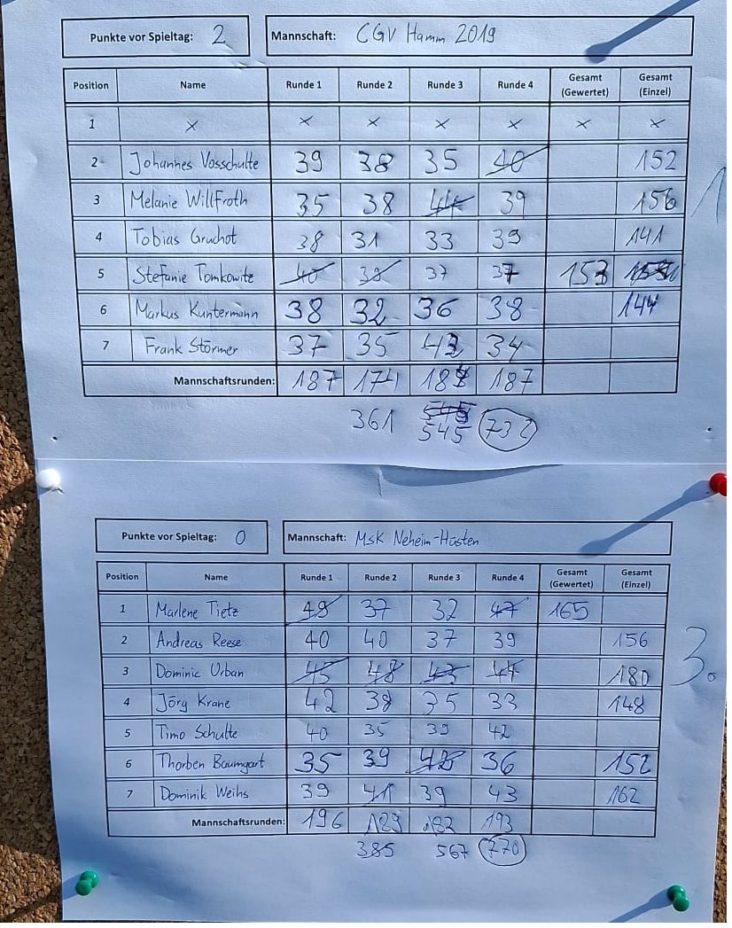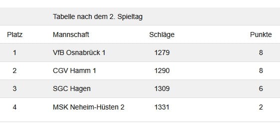 Für uns geht es in drei Wochen zum vorletzten Spieltag nach Neheim-Hüsten. Die Tabellensituation sieht aktuell für uns sehr gut aus. Wir stehen auf einem geteilten ersten Platz mit Hamm und der besseren Gesamtschlagzahl. Dahinter folgen der SGC Hagen und der MSK Neheim-Hüsten.
