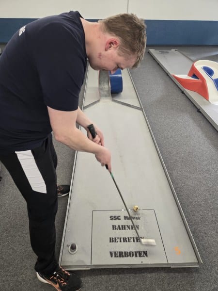 Fabrice Lange zauberte ebenfalls auf seinen Erfolgsrunden. Beispielhaft Runde 1, wo er mit Vorlauf an der Schleife und am Pitauge mit rechter Fensterkante und linker Bande zum Ziel kam und letztlich eine 21 spielte. Auch am Blitz waren es „Kalla“ und ich, die es häufiger mal schafften, beim Versuch des direkten Durchspielens an der Kante hängen zu bleiben und wieder von vorne spielen zu müssen.