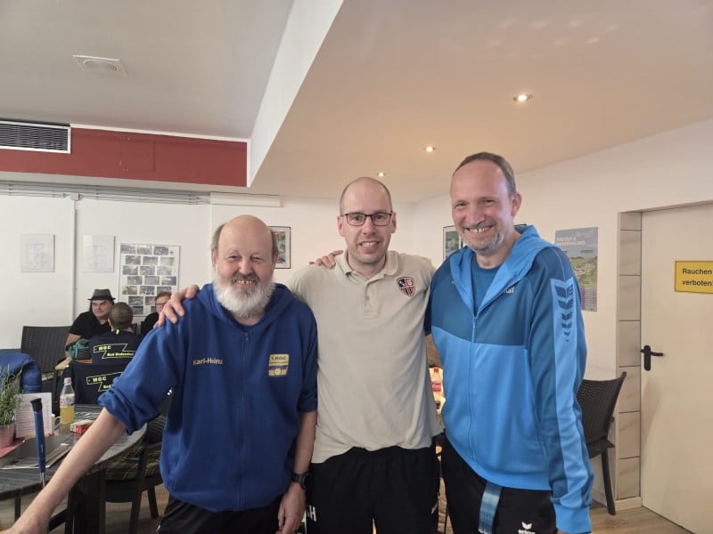 Karl-Heinz schoss aber den Vogel ab, als er mit der „Mittelkante“ und linker Bande erfolgreich war. Zudem schnappte er sich als Linkhänder jeweils einmal von Ralf und mir den Schläger, um mit rechts die Doppelwelle vom Start weg und den Blitz aus der Heimat zu lochen.